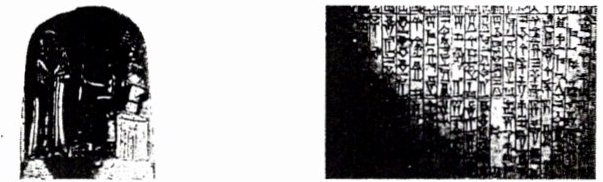 材料一 《汉谟拉比法典》石柱。上部(左图):太阳神授予汉谟拉比权标的浮雕。下部(右图):法典具体条文。