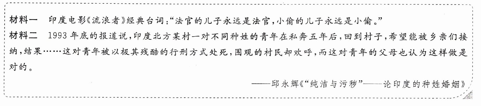 情境任务2 根据如下材料,分析种姓制度的特点和实质。谈谈种姓制度对印度造成的影响。(6分)