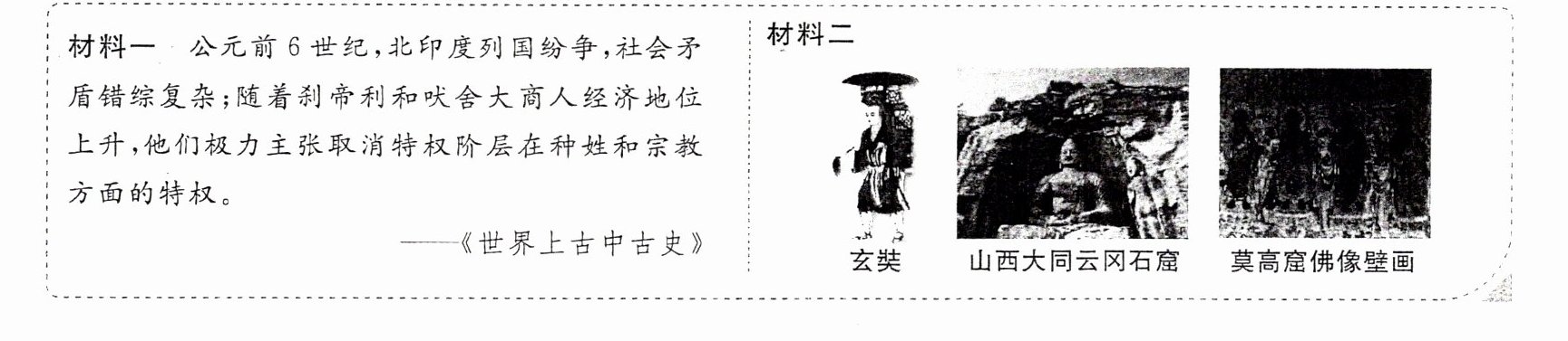 情境任务3 根据材料一,概括佛教诞生的历史背景。根据材料二并结合课本,说一说古代印度的佛像艺术对我国哪些艺术领域产生了重要影响。据此,请你谈一谈对区域之间文明交流的认识。(6分)