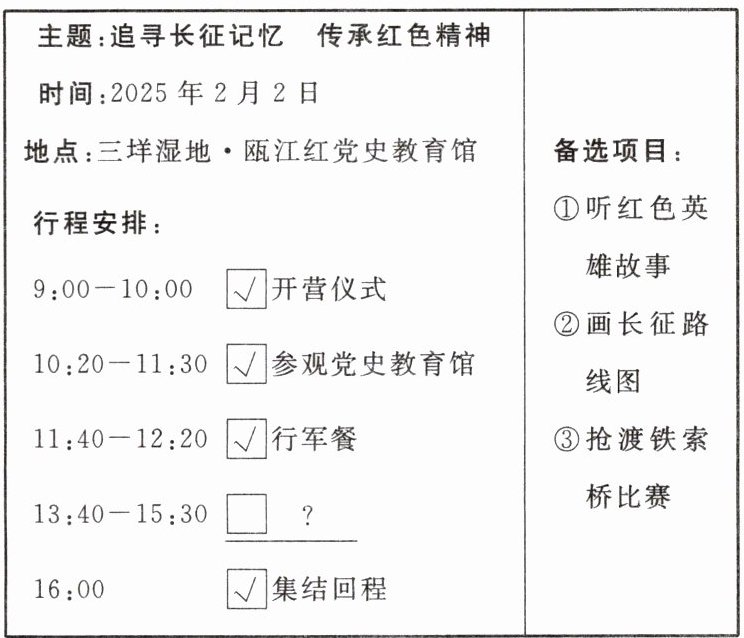 12. 请根据研学主题,从备选项目中选择合适的一项,补全行程安排,并结合《红星照耀中国》或《长征》中相关内容及阅读体验,说明理由。
