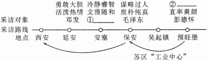9. (贵州贵阳模拟)小阳同学在阅读《红星照耀中国》后,绘制了一幅斯诺采访“红色中国”的主要路线图。请你帮他完成下图相对应的内容。