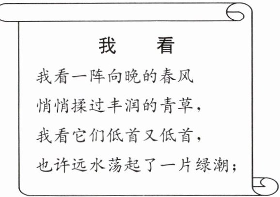 4 请仿照穆旦《我看》的第一节,描述自己印象深刻的一个画面。(要求:画面自然和谐,有诗意;诗歌结构大致相同,句式、字数可灵活变化)