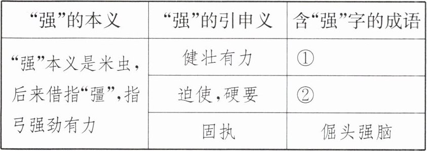 (2)下面是小雯整理的关于“强”字的资料卡片,请你在①②处分别补充一个含“强”字的成语。