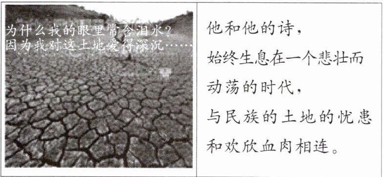 [解析] 图片中,在一大片龟裂的土地上,一棵树孤独而坚强地生长着。图片上配有艾青的诗句"为什么我的眼里常含泪水?因为我对这土地爱得深沉……",诗句中,诗人赋予"土地"深邃的含义,它是祖国、民族、人民和文化的象征。诗人用诗的语言,深情地表达了对祖国的无限热爱,以及对祖国命运的深切关注。右边的语句是对艾青及其作品的高度评价。艾青的诗歌反映了那个时代的社会背景和人民的生活状态,而他的个人经历也与那个时代的动荡和变革紧密相关。艾青的诗歌不仅关注民族的忧患,也表达了对祖国、人民的热爱和希望。他的诗歌中充满了对生活的热情和对未来的憧憬,这种情感也是那个时代人民内心深处的渴望和追求。艾青的诗歌和人生都与那个悲壮而动荡的时代紧密相连,他的诗歌不仅是个人情感的表达,更是那个时代民族情感和人民心声的反映。