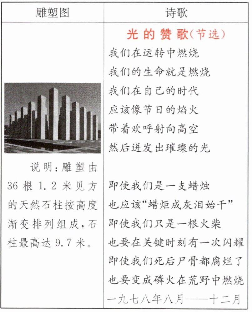 [解析]分析雕塑:从雕塑的构成来看,它由36根1.2米见方的天然石柱按高度渐变排列组成,石柱最高达9.7米。这些石柱的排列和高度变化可能象征着一种力量的积聚或者一种向上的趋势;石柱给人一种坚实、挺拔的感觉,就像生命中蕴含着的力量,等待着爆发或者释放。分析诗歌主题:诗歌主题强调生命的燃烧和发光。如从“我们在运转中燃烧/我们的生命就是燃烧”,可以看出表达了生命应该是充满活力、积极向上的,要像火焰一样燃烧自己;从“我们在自己的时代/应该像节日的焰火/带着欢呼射向高空/然后迸发出璀璨的光”,这里把生命比作焰火,在特定的时刻要释放出最耀眼的光芒;从“即使我们是一支蜡烛/也应该‘蜡炬成灰泪始干’/即使我们只是一根火柴/也要在关键时刻有一次闪耀/即使我们死后尸骨都腐烂了/也要变成磷火在荒野中燃烧”,提到即使是蜡烛、火柴,甚至死后变成磷火也要燃烧发光,可知强调了生命无论处于何种状态都要发光发热的主题。结合两者分析:雕塑中的石柱可以看作是生命力量的象征,就如同诗歌中所表达的生命蕴含着燃烧发光的力量。石柱的高度渐变排列,从低到高,仿佛是生命从积聚力量到最终爆发发光的过程,这与诗歌中生命要燃烧和发光的主题相呼应;从整体上看,雕塑的坚实、挺拔以及向上的排列趋势,能够反映出诗歌中积极向上、充满力量、渴望燃烧发光的主题。所以,该雕塑能反映诗歌《光的赞歌》的主题。