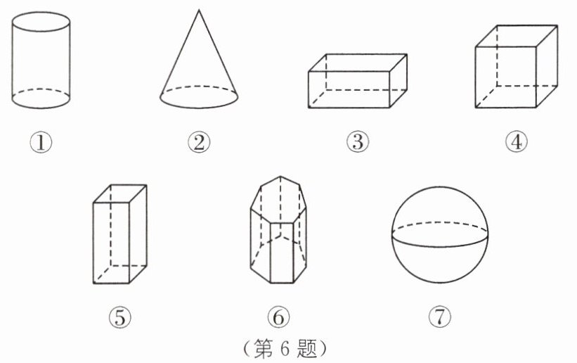 C [解析]柱体分为圆柱和棱柱,所以题图中的柱体有①③④⑤⑥,共5个.故选 C. 归纳总结 本题考查认识立体图形,掌握棱柱、棱锥、球的形体特征是正确判断的前提.