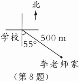 8. 如图,李老师家在学校的南偏东$55^{\circ}$方向,距离是$500m$,则学校在李老师家的( ).