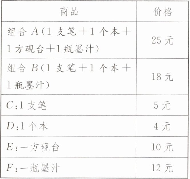 13 新情境 数学与生活融合 (2023·北京平谷区期末)张老师准备为书法兴趣小组的同学购买上课的用具,在文具商店看到商店有 A,B 两种组合和 C,D,E,F 商品及它们的售价如下表所示,组合及单件商品质量一样.若该小组共有 12 人,其中,笔和本每人各需要一份,砚台 2 人一方即可,墨汁 n 瓶$(n≥3)$.张老师共带了 200 元钱,请给出一个满足条件的购买方案 (购买数量写前面,商品代码写后面即可,例如:2A+3B+…);n 最大为