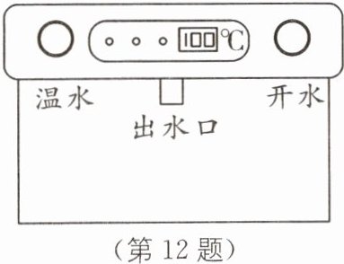 12 跨学科 热传递 (2023·南京中考)如图,某校的饮水机有温水、开水两个按钮,温水和开水共用一个出水口.温水的温度为$30^{\circ}C$,流速为20mL/s;开水的温度为$100^{\circ}C$,流速为15mL/s.某学生先接了一会儿温水,又接了一会儿开水,得到一杯280mL温度为$60^{\circ}C$的水(不计热损失),求该学生分别接温水和开水的时间.
