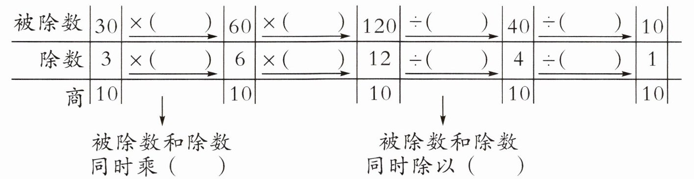 | 被除数 | 30 $×(\quad)$ | 60 $×(\quad)$ | 120 $÷(\quad)$ | 40 $÷(\quad)$ | 10 |