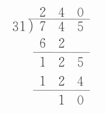 $\begin{array}{r}240\\31\enclose{longdiv}{745}\\62\\\hline125\\124\\\hline10\end{array} $( )