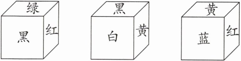 [提示]第一个正方体和第二个正方体上均出现了黑色,以及与黑色相邻的红色、绿色、白色、黄色,因为没有蓝色,所以黑色所对的面是蓝色;第二个正方体和第三个正方体均出现了黄色,以及与黄色相邻的黑色、白色、蓝色、红色,因为没有绿色,所以黄色所对的面是绿色;最后推出红色所对的面是白色。
