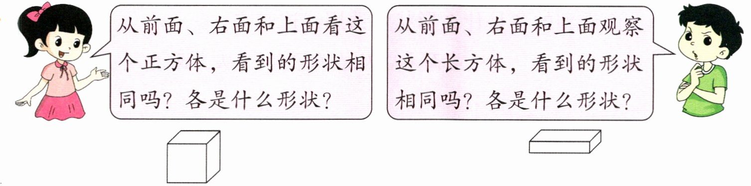 1.从前面、右面和上面看这个正方体,看到的形状相同吗?各是什么形状?从前面、右面和上面观察这个长方体,看到的形状相同吗?各是什么形状?