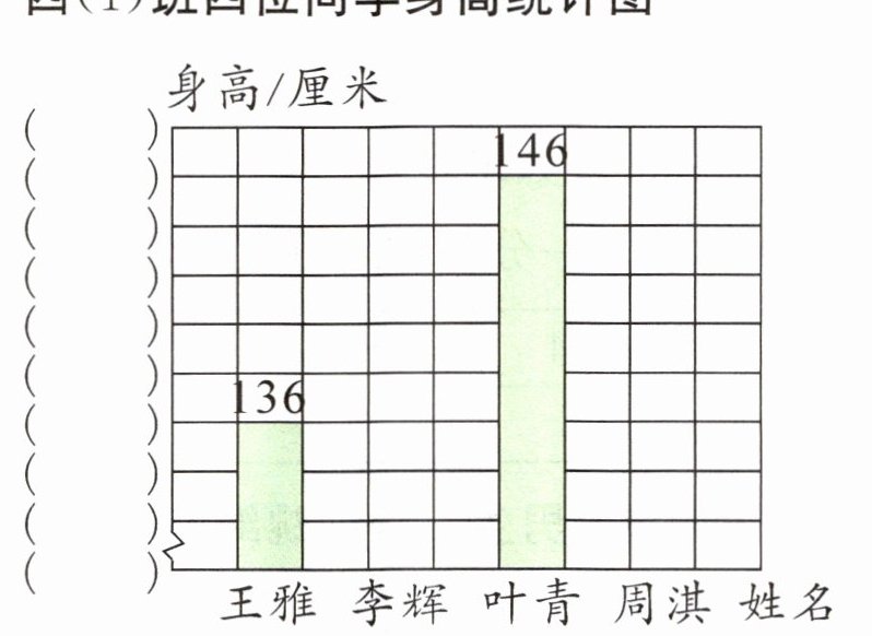 (2)148-136=12(厘米) [提示]依据已知的两位同学的身高,可知纵轴的每一小格表示(146-136)÷5=2(厘米),则纵轴上的数据从下往上依次为0、132、134、136……148。李辉身高为136+6=142(厘米),周淇身高为146+2=148(厘米)。