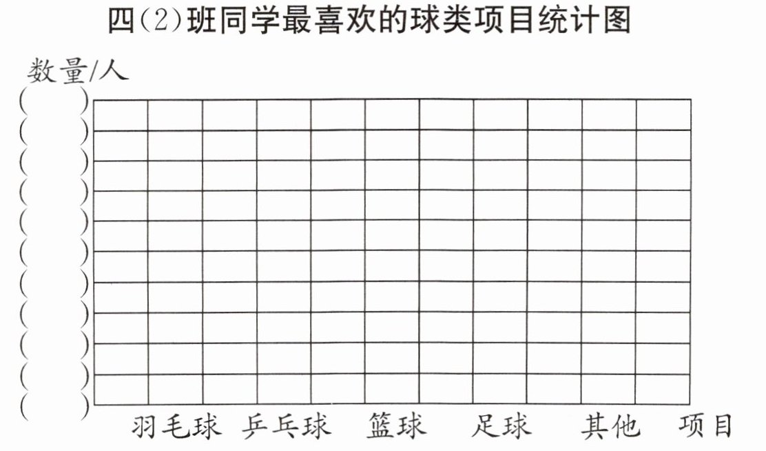 4. 新情境 杭州亚运会 第19届亚运会在杭州举办,该届比赛中球类运动项目丰富多彩。观看比赛的同时也激发了四(2)班同学们进行球类运动的热情。班长对本班同学最喜欢的球类项目进行了调查,请根据表中数据完成条形统计图。