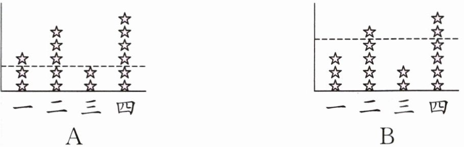 4. 原创题 数据意识 评比可以激发同学们参与各项活动的热情。下面是四(2)班在“卫生评比”活动中连续四周获得的星星个数统计图,虚线位置能表示该班平均每周获得的星星个数的是( )。