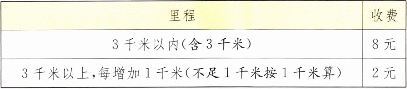 [提示]本题考查分段计费问题。先算出3千米以内和3千米以上的付费情况,再解答。