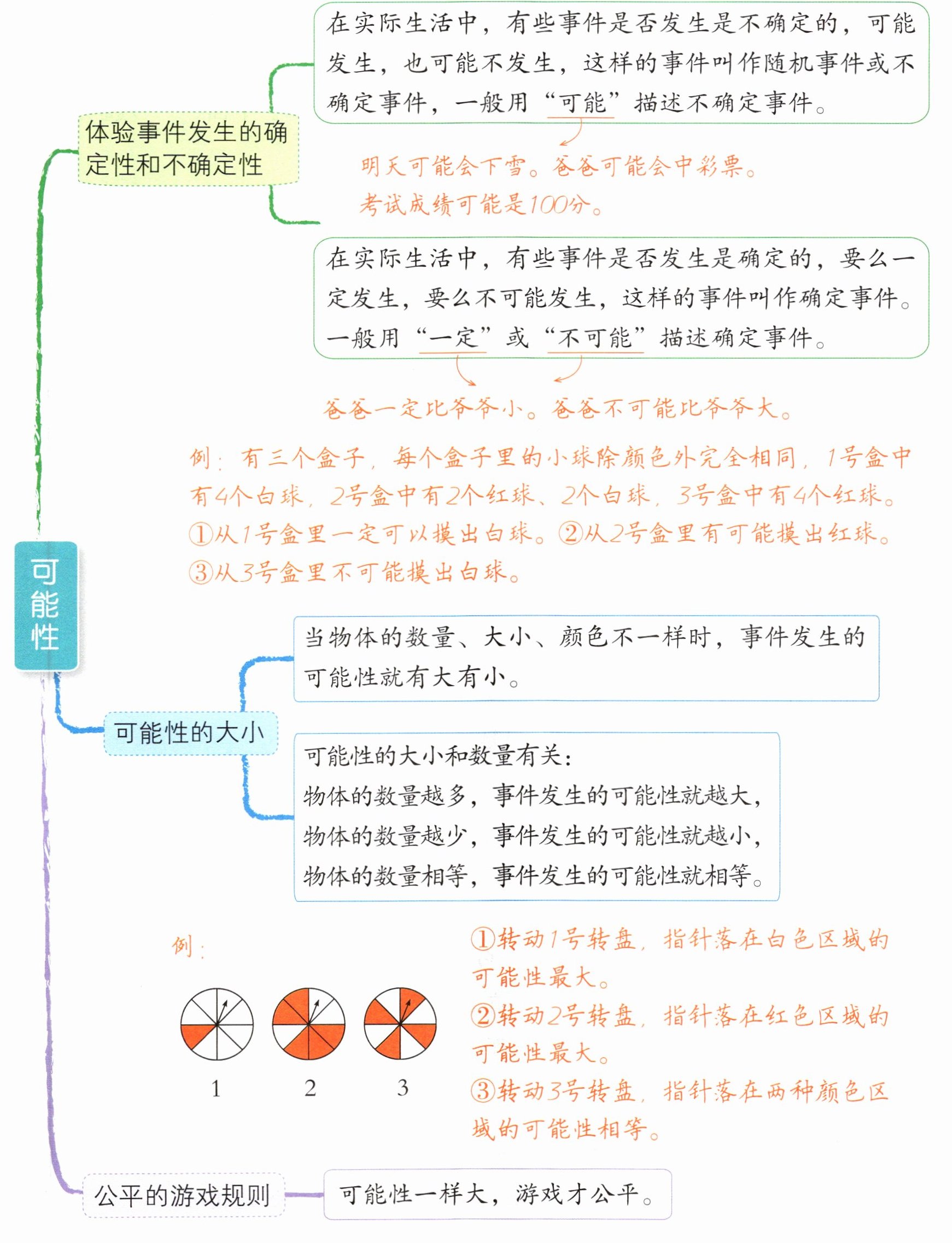例:有三个盒子,每个盒子里的小球除颜色外完全相同,1号盒中有4个白球,2号盒中有2个红球、2个白球,3号盒中有4个红球。①从1号盒里一定可以摸出白球。②从2号盒里有可能摸出红球。③从3号盒里不可能摸出白球。