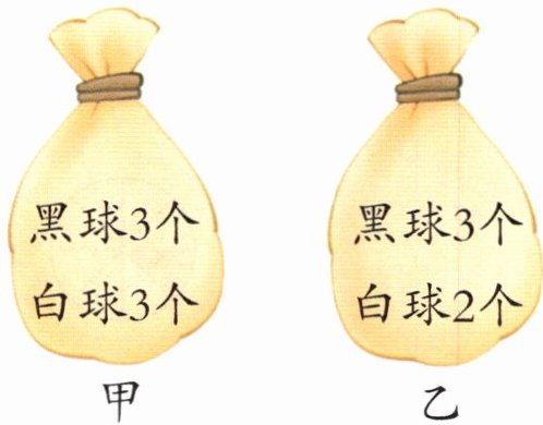 思路分析 甲口袋里有3个黑球和3个白球,摸到黑球和摸到白球的可能性是相等的;乙口袋里有3个黑球和2个白球,摸到黑球的可能性比摸到白球的可能性大。