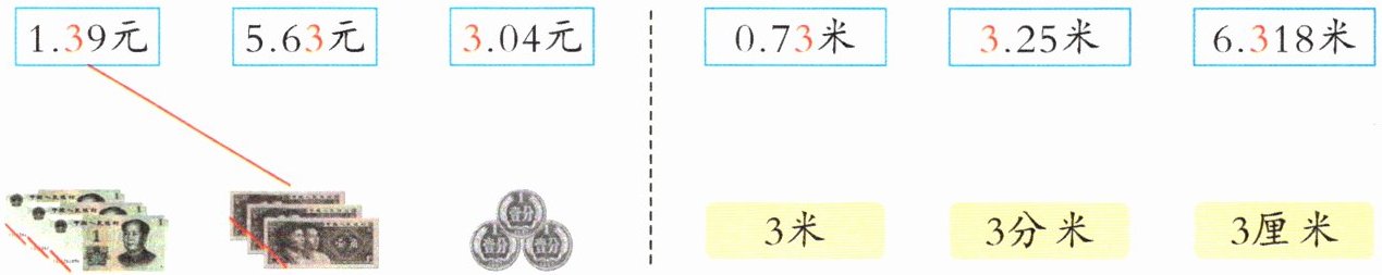 0.7 0.21 0.309 $\frac{25}{100}$ $\frac{37}{1000}$ [提示]分母是 10、100、1000……的分数都可以用小数表示,一位小数表示十分之几,两位小数表示百分之几,三位小数表示千分之几……