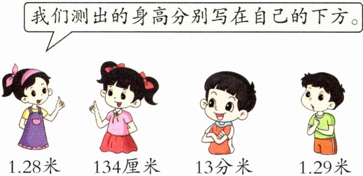 1.28米<1.29米<13分米<134厘米 [提示]1.28 米=1.28 米,134 厘米=1.34 米,13 分米=1.3米,1.29米=1.29米,因为1.28米<1.29米<1.3米<1.34米,所以1.28米<1.29米<13分米<134厘米。