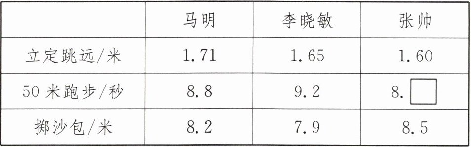 5. 原创题 数据意识 希望小学举办了一场春季运动会。下表是马明(男生)、李晓敏(女生)、张帅(男生)参加不同运动项目的成绩。