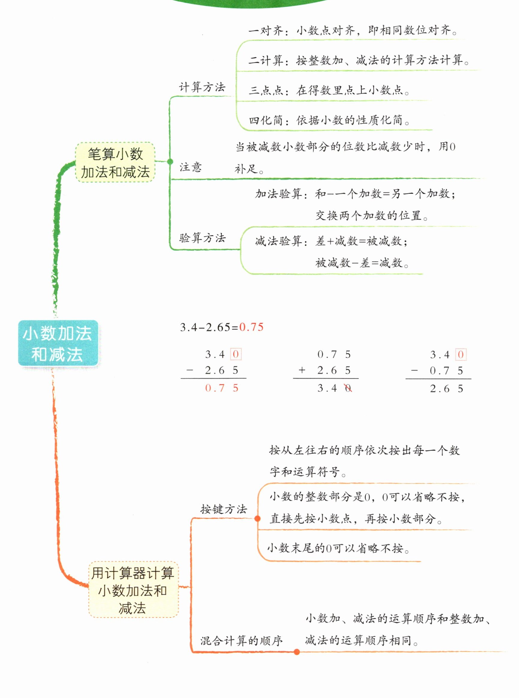 用计算器计算小数加减法时,按从左往右的顺序依次按出每一个数字和运算符号,小数的整数部分是 0 可以省略不按,直接先按小数点,再按小数部分,小数末尾的 0 可以省略不按,且小数加、减法的运算顺序和整数加、减法的运算顺序相同。