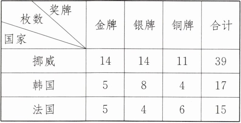 (2)39-15=24(枚)[提示]在表头中找到“合计”一列,挪威获得的奖牌是39枚,法国获得的奖牌是15枚,39-15=24(枚)。
