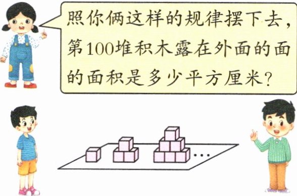 6. 小明和小华在草地上一起玩堆积木的游戏,他们将若干个棱长1厘米的小正方体积木按如右下图方式摆在地上,刚好摆了三堆。当他俩玩得正酣时,小红正好路过这里,于是就考起了他们俩。