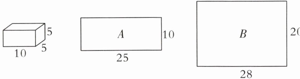 10×5×4+5×5×2=250(平方厘米)A:10×25=250(平方厘米)B:28×20=560(平方厘米)表面积正好等于包装纸A的面积,因为有损耗,肯定不够,所以选包装纸B。[提示]先用表面积公式求出长方体的表面积,因为包装有损耗,纸的面积一定大于长方体的表面积,所以包装纸A的面积不够,而包装纸B的面积大于表面积,所以选B。