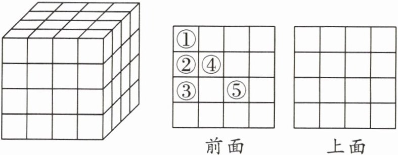 用棱长为1厘米的小正方体拼成一个大正方体,在大正方体表面涂色后,从不同位置观察得到的图形。