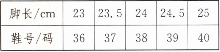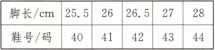 4. 新情境“看手拿鞋” 某第一百货商店的营业员练就一手绝活儿——“看手拿鞋”,她经过多年研究发现:通常情况下,人手的长度是脚长的$\frac {3}{4}$,因此只需看顾客的手,就可以推算出鞋号。脚长和鞋号对照表如下: