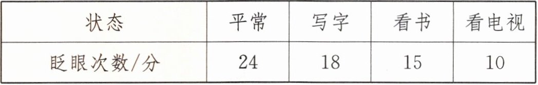 4. 人正常的眨眼可以缓解眼睛的疲劳,眨眼次数过少不利于眼睛的健康,容易诱发眼部疲劳,使原有的病情加重以及诱发干眼症。下表是人在各种状态下每分钟眨眼的次数。