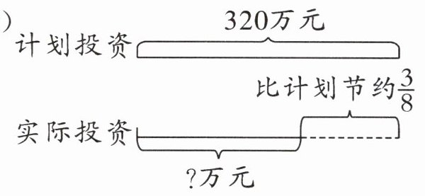 (2)$320×(1-\frac{3}{8})=200$(万元) [提示]根据题意可知,计划投资 320 万元,实际投资的钱数比计划节约 $\frac{3}{8}$,是把计划投资的钱数看作单位“1”,实际投资的钱数相当于计划投资的 $(1-\frac{3}{8})$,用计划投资的钱数乘 $(1-\frac{3}{8})$,就是实际投资的钱数。