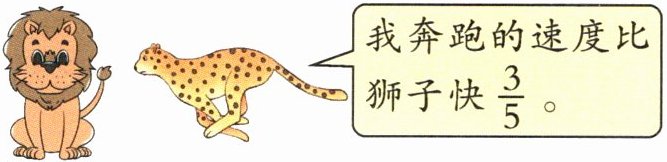 $60×(1+\frac{3}{5})=96$(千米) [提示]根据题意可知,狮子每小时跑 60 千米,猎豹的奔跑速度比狮子快 $\frac{3}{5}$,是把狮子的奔跑速度看作单位“1”,猎豹的奔跑速度相当于狮子的 $(1+\frac{3}{5})$,用狮子每小时奔跑的路程乘 $(1+\frac{3}{5})$,就是猎豹每小时奔跑的路程。