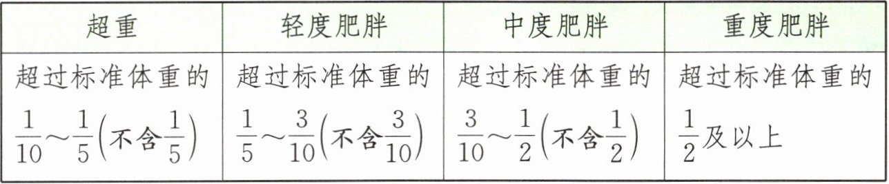 |超过标准体重的$\frac{1}{10}~\frac{1}{5}$(不含$\frac{1}{5}$)|超过标准体重的$\frac{1}{5}~\frac{3}{10}$(不含$\frac{3}{10}$)|超过标准体重的$\frac{3}{10}~\frac{1}{2}$(不含$\frac{1}{2}$)|超过标准体重的$\frac{1}{2}$及以上|