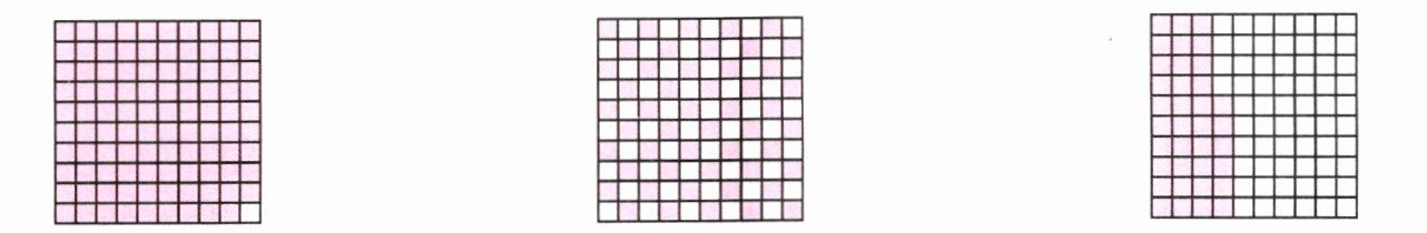 [提示]整个正方形由100个小方格组成,涂色部分和空白部分有几个小方格就是百分之几。第一幅图空白部分是1个小方格,表示1%,涂色部分有99个小方格,表示99%;第二幅图空白部分和涂色部分都是50个小方格,表示50%;第三幅图涂色部分是36个小方格,表示36%,空白部分是64个小方格,表示64%。