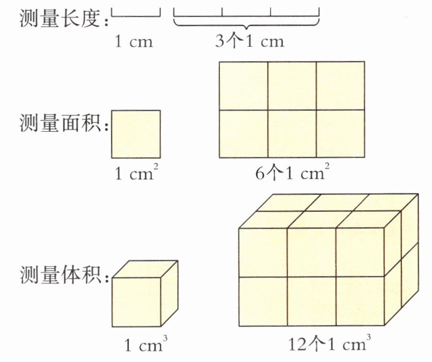 我同意欢欢的想法。因为测量长度、面积和体积都需要统一的标准,即用相同的计量单位去测量,看需要测量的物体的长度、面积和体积里包含了多少个这样的计量单位,那么这个物体的长度、面积和体积就是多少。
