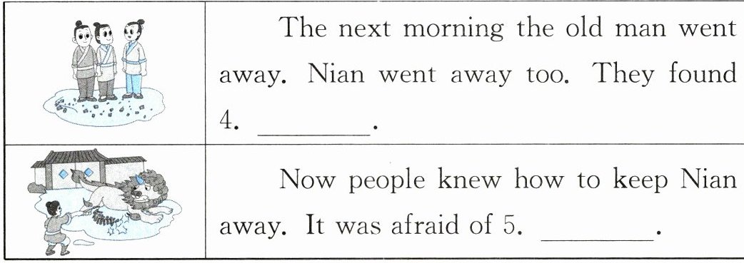 The next morning the old man went away. Nian went away too. They found 4. ______.