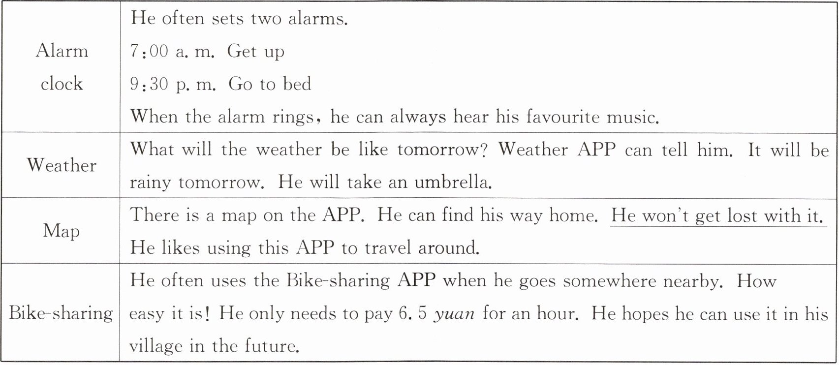 | Bike-sharing | He often uses the Bike-sharing APP when he goes somewhere nearby. How easy it is! He only needs to pay 6.5 yuan for an hour. He hopes he can use it in his village in the future. |