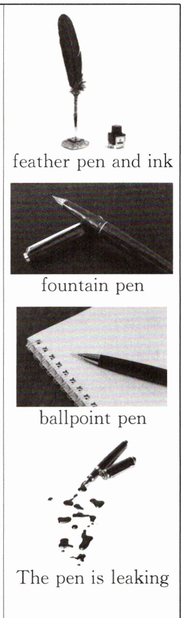 People wrote with feather pens and then used pens with metal points. They had to dip(蘸) the point into ink after every few letters. Next, someone invented a fountain pen that could hold ink inside it. A fountain pen can write several pages before you have to fill it again.