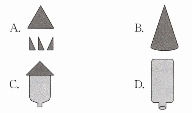 1. D [解析]细节理解题。根据"Use markers to draw three small triangles(三角形)and one large triangle on the poster board. Cut out the triangles."可知,要用到3个小三角形和1个大三角形,共4个。故选D。2. C [解析]图片理解题。根据"Step 4 Glue the nose cone to the bottom of the bottle to make the top of the rocket."可知,第4步是把锥体粘在瓶子的底部,做成火箭的顶部。C项符合做成之后的样子。故选C。3. A [解析]文章出处题。本文主要讲述了手工火箭的制作步骤,最可能来自报纸的"DIY科学"版块。故选A。