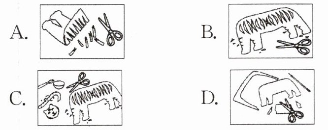 【文章大意】本文描述了如何剪纸老虎。1. A [解析]细节理解题。根据“Draw a simple outline of a tiger body on paper to fill about half an A4 paper. Then cut it out.”可知,第一步需要在纸上画老虎身体,然后剪出来。故需要用到铅笔、纸和剪刀。故选 A。2. B [解析]图片理解题。根据“Carefully open out the paper and flatten(压平)the folds. Now you have the stripes(条纹)for the body. Next,make small stripes along the legs.”可知,此步骤要把纸打开,弄平整,沿着腿剪出条纹,B 选项的图片符合。故选 B。3. D [解析]细节理解题。根据第六步“Brush glue over the back of the body,head and tail and stick onto the background card.”可知,在老虎身体上涂上胶水之后,接下来把它粘贴在背景卡片上。故选 D。4. C [解析]文章出处题。本文主要描述如何剪纸老虎,属于 DIY 范畴。故选 C。