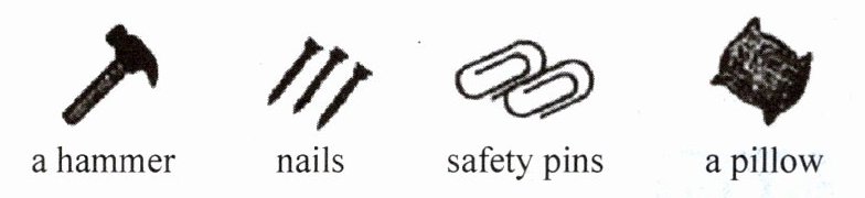 Seven boards(each 10 cm wide):one 160 cm long; three 50 cm long; one 30 cm long; two 60 cm long,a hammer and nails;safety pins;a pen;a shirt with long sleeves;long trousers;gloves and boots;a hat and a pillow;an adult helper.