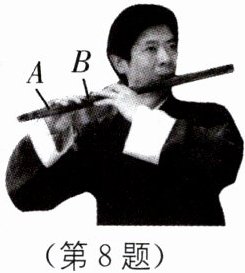 8 音乐会上,民族乐队正在演奏,演员甲演奏二胡,二胡发声是由于琴弦______产生的.演员乙正在吹笛子,如图所示,只松开A孔和只松开B孔相比,笛子发出的声音的______一定发生了变化.这两种声音在空气中传播时的速度相比,______(填“笛声更大”“二胡声更大”或“一样大”),听众能分辨出笛声和二胡声,主要是因为这两种声音的______不同.