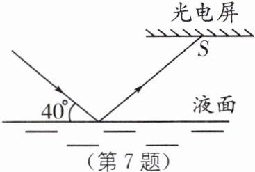 7. 中考新考法 利用光的反射测量高度 有一测量液面高度的光电仪器,它是通过光束在液面上的反射光线射到光电屏上的光斑的位置来判断液面高低的。如图所示,一束光与液面的夹角为40°,则反射角的大小是____。当入射光方向不变时,若光电屏上的光斑S向左移动,则说明液面在____(填“上升”或“下降”),这时反射角是____。