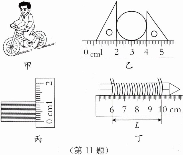 11. B [解析]自行车车轮的周长可以测出,要测量自行车通过的路程,可以先记下车轮转过的圈数N,再乘以车轮的周长L,故A正确,不符合题意;由图乙可知,刻度尺上1cm之间有10个小格,所以1个小格代表的长度是0.1cm=1mm,即此刻度尺的分度值为1mm,纪念币左端与2.00cm对齐,右端与4.00cm对齐,所以纪念币的直径L=4.00cm-2.00cm=2.00cm,故B错误,符合题意;一张纸的厚度太小,小于刻度尺的分度值,无法直接准确测量,所以测量纸的厚度时,可以用刻度尺先测出几十张纸的厚度,然后再除以纸的总张数,即得出一张纸的厚度,故C正确,不符合题意;细金属丝的直径太小,小于刻度尺的分度值,无法直接准确测量,所以可以把金属丝无间隙地紧密绕在一根铅笔上若干圈,测出密绕部分的长度L和圈数N,则金属丝的直径D= $\frac{L}{N}$,故D正确,不符合题意.