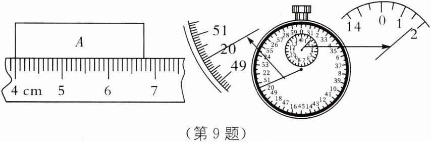 9 图中物体 A 的长度为______cm,秒表的读数为______s.