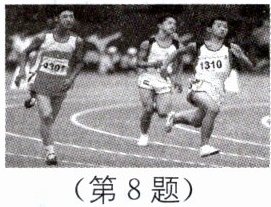 8 教材 P131 图 5-18·改编 如图所示是某中学运动会上百米比赛时的情景,场下座席上的观众认为最前面的同学跑得最快,这是采用了相同 ,比较 的方法;小阳和小光分别是两个小组的百米第一,若要比较他俩谁更快,就要采用比较 (填"时间"或"路程")的方法.