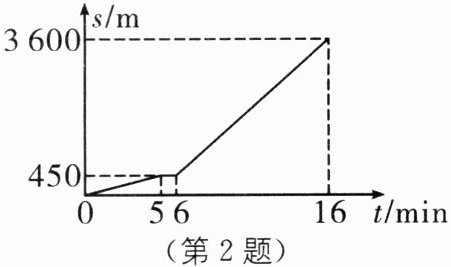 3150 3.75 [解析]本题考查速度的计算、速度公式的应用.由图像可知,0~5min内小明做匀速直线运动,通过路程s₁=450m;5~6min内通过的路程为0,处于静止状态;6~16min内,做匀速直线运动,通过的路程s₂=3600m-450m=3150m;0~5min内小明的速度v₁=s₁t₁=450m5×60s=1.5m/s;6~16min内小明的速度v₂=s₂t₂=3150m10×60s=5.25m/s;故6~16min内小明骑行,通过的路程为3150m;全程的平均速度v=st=3600m16×60s=3.75m/s.
